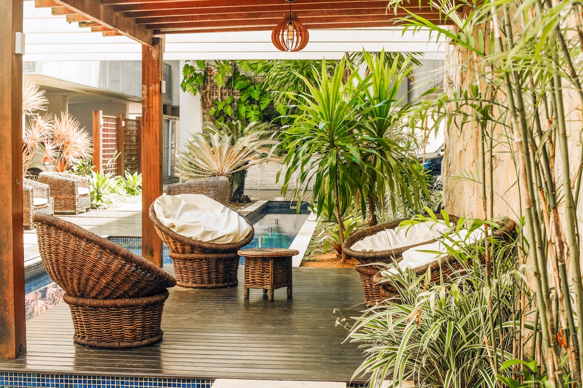 É uma casa de praia bem protegida contra insetos com portas extras de tela e janelas com tela dupla. É um hambiente que usa a cor branca e toda a parte de madeira com cor de ipê (mais escuro), as portas externas são no estilo mexicana. O piso é feito de ladrilhos brancos com rodapé de 30cm no mesmo material. Os moveis são de madeira de lei as vezes com vidro. Todas as construçoes são feitas em tijolo massiço aparente lembrando um estilo milenar de construções mediterraneas e marroquinas