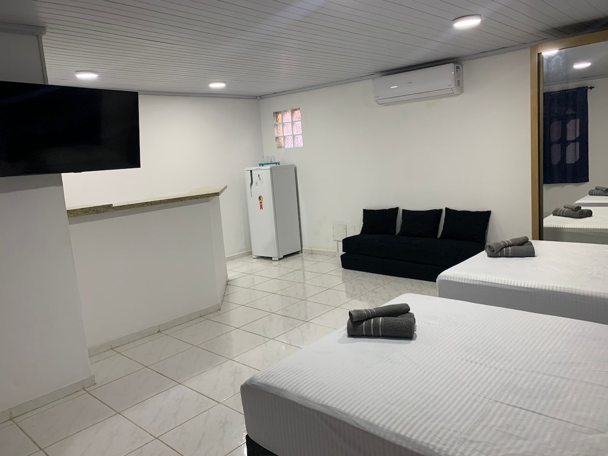 O espaço são 5 suítes com banheiros privativos e uma área de churrasqueira com fogão e geladeira, ideal para grupos de até 12 pessoas. Todas as suítes tem Ar condicionado e seu banheiro. Não tem tv nos quartos e não tem sala, é apenas as suítes, o grande jardim e área gourmet. No jardim tem um chuveirão para o pós praia e o espaço é bem grande e com plantas. No mesmo terreno tem uma casa onde o proprietário mora sozinho.