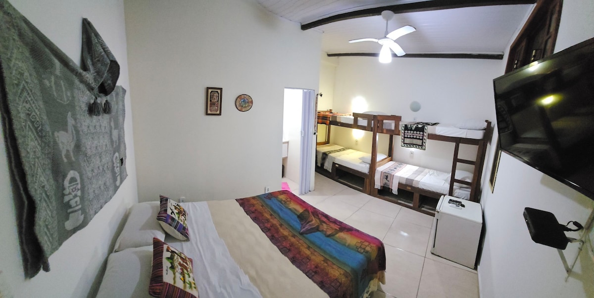 O Quarto da Vovó acomoda de 2 a 4 pessoas, com uma cama de casal e colchonetes de solteiro. A suíte possui terraço coberto e está localizada no segundo andar, oferecendo uma varanda coberta. O quarto também inclui roupas de cama e de banho, além de uma entrada privativa.