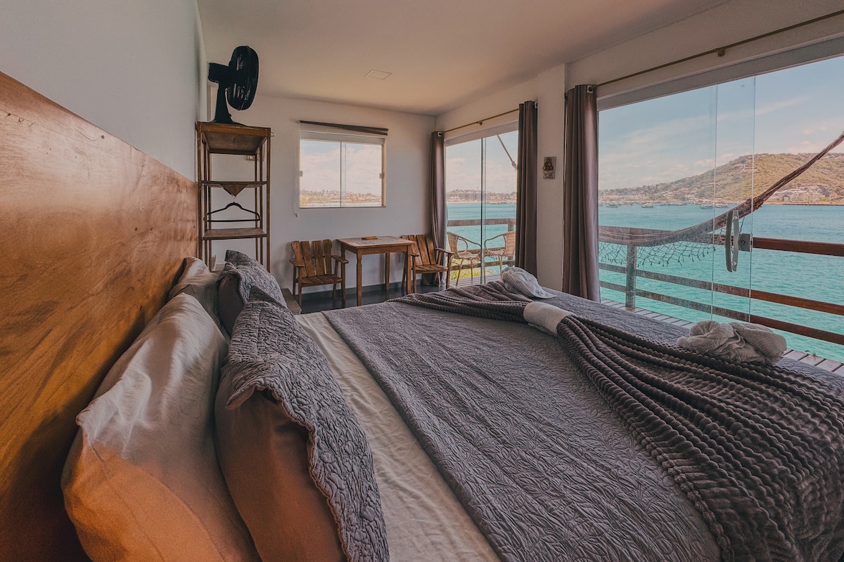 A suíte Garda Azul está no Pontal do Atalaia e possui vista para o mar e montanhas . Tem acesso independente e completa privacidade. Banheiro completo , frigobar, armário e varanda com vista para o mar. Decoração clássica , roupa de cama de qualidade , banheiro super confortável: tudo o que você precisa para aproveitar as melhores praias de Arraial do Cabo. Não possui acesso ao terraço ou piscina . Um espaço perfeito para relaxar com a família ou amigos.