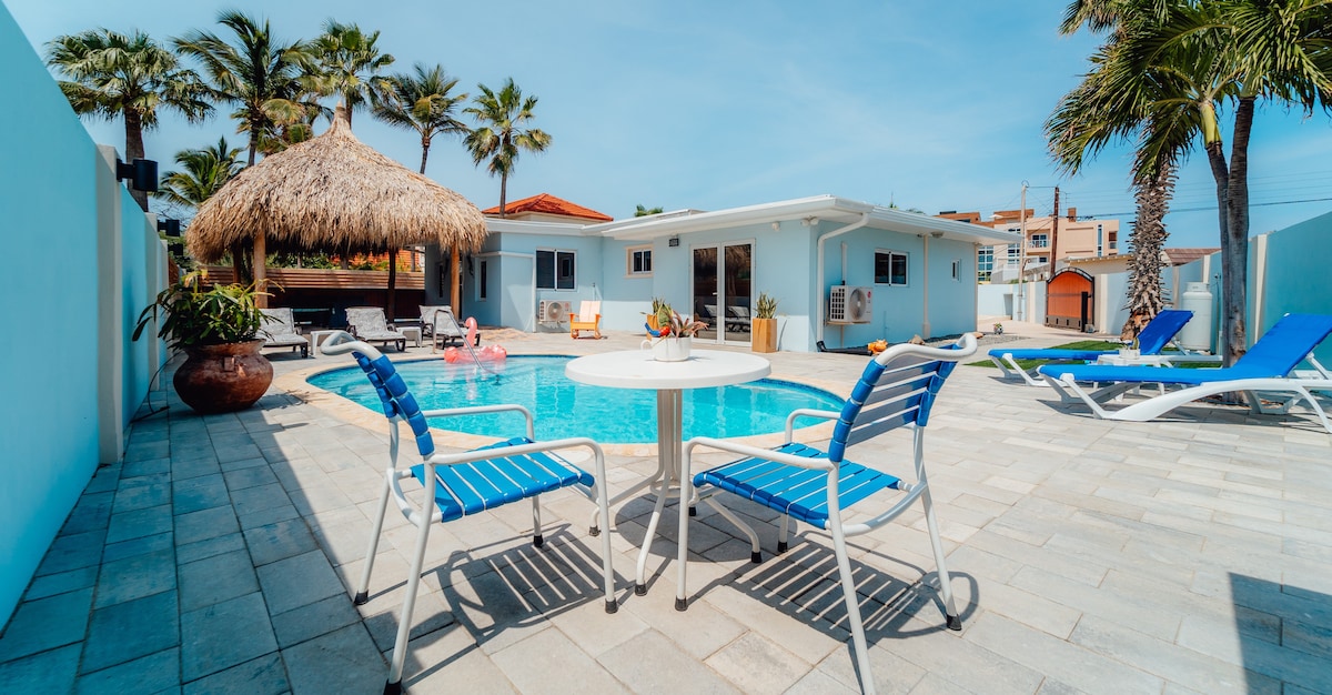 Experience Aruba from the comfort of this modern, comfortable home with a 5-minute walk to some of the world's greatest beaches. The house is in a very quiet neighborhood with a PRIVATE backyard. Enjoy your own sky-blue pool, bar-b-que, tiki bar, and sitting areas. An excellent choice for families who want to live like the island locals and enjoy nearby restaurants, night clubs, resorts, malls, and beaches.
