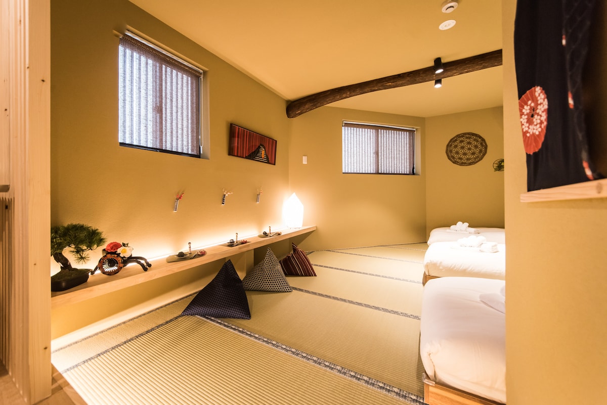 「Tabitabi 神泉」邻近京都平安时代最古老之名园「神泉苑」因而得名,是由大正年间建造的百年京町屋改造而来的传统二层京町屋旅馆,历时一年的改造后,以全新面貌呈现在世人面前。传统日式天然木材和日式材料的大面积使用,让房间极具传统日本风格,一进到屋里,印入眼帘的是开阔的空间及牆面上深色和纸带来的沉稳视觉感受,采用樱花木的木质地板,壁纸则是选用樱花木质纹理,如同樱花飘落一般的视觉飨宴,更有父子两代造院师的倾力相助,精心设计出和风庭院的静谧柔美,二层露台特别设计的日式枯山水庭园,通过雪见窗的设计,让您躺在床榻上便能欣赏,半露天的手工桧木浴缸让您尽享原汁原味的日式生活。一天旅途的劳累,夜晚泡着半露天的风吕小酌一杯日本清酒,空气中散发着桧木精油香味,享受着美不胜收的日式庭园。期待我们的小屋子可以给您的旅途带来与众不同的体验。