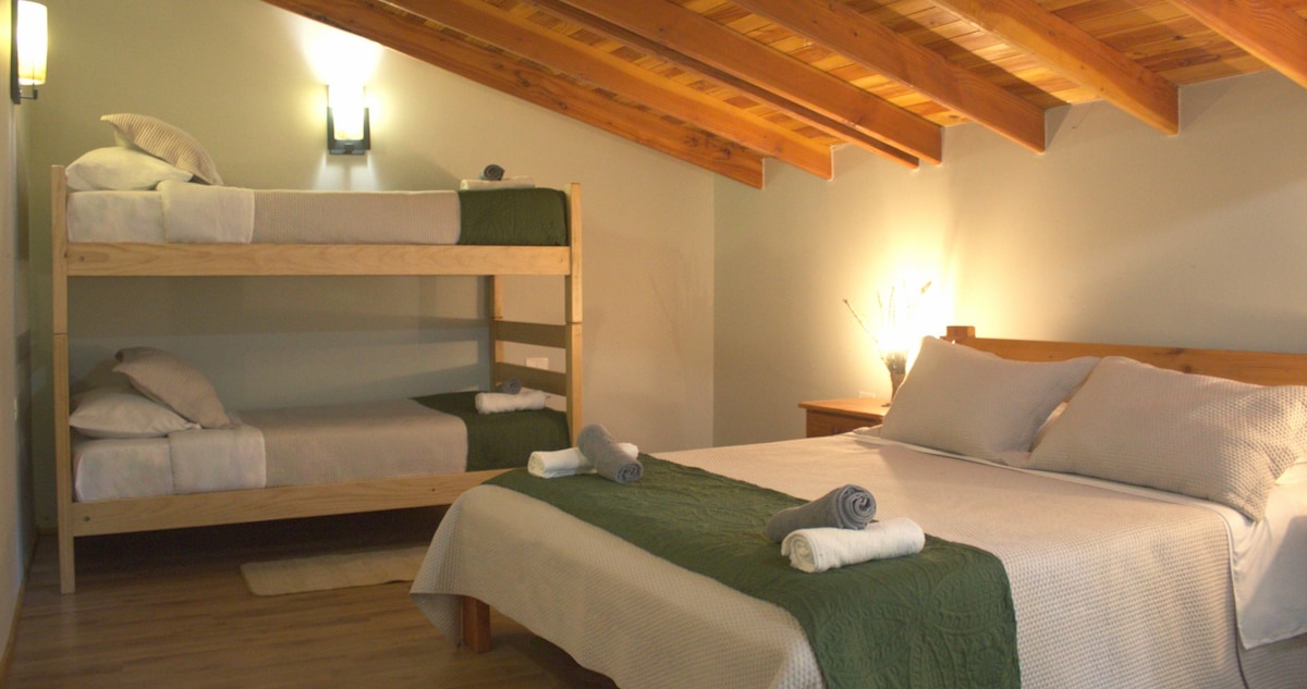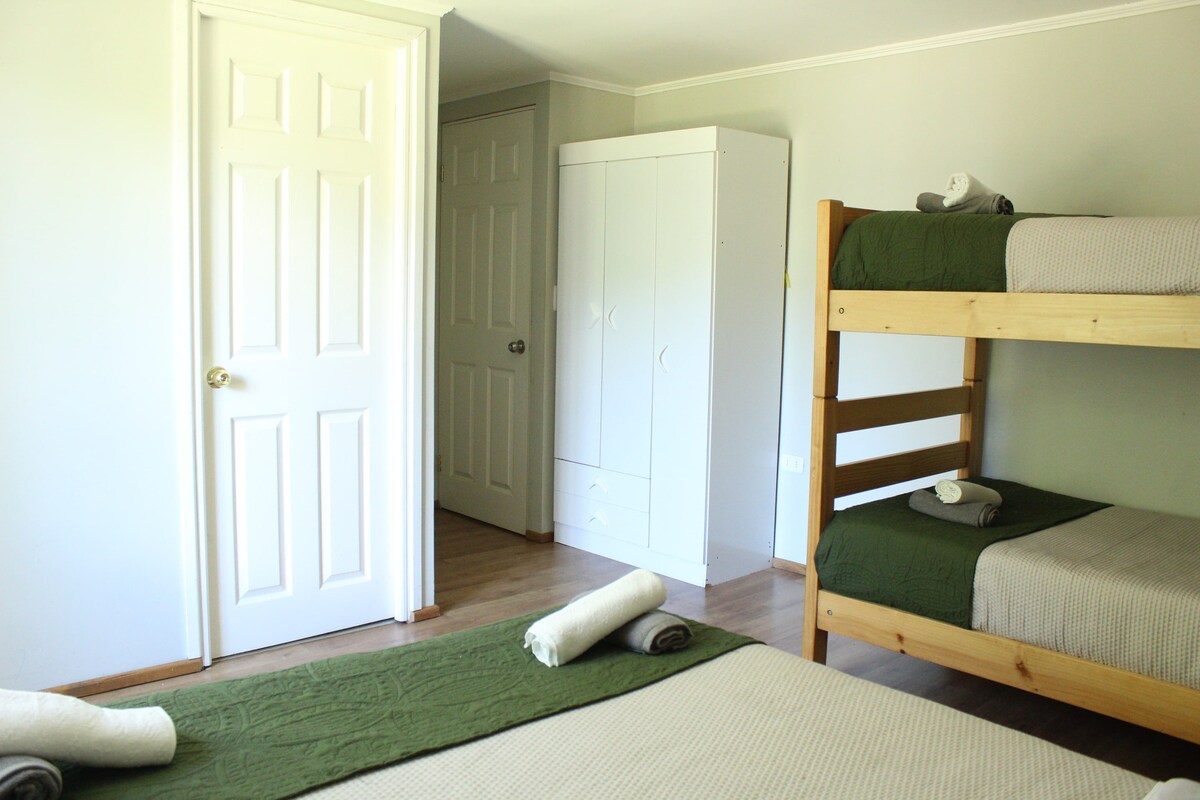 ¿Qué incluye? ° 1 Cama matrimonial ° 1 Futón Cama ° A/C ° Baño Privado ° Terraza privada con vista al estero ° Estacionamiento gratuito ° WiFi ° TV en área común ° Cocina equipada en área común Estamos ubicados a 3,5 Km. del centro de Pucón con acceso directo a ciclo vía, locomoción colectiva y comercio. Beneficios Adicionales • Acceso a terraza con vista al estero • ⛳ 50% de dcto en Mini Golf Pucón • Se admiten mascotas por un valor adicional