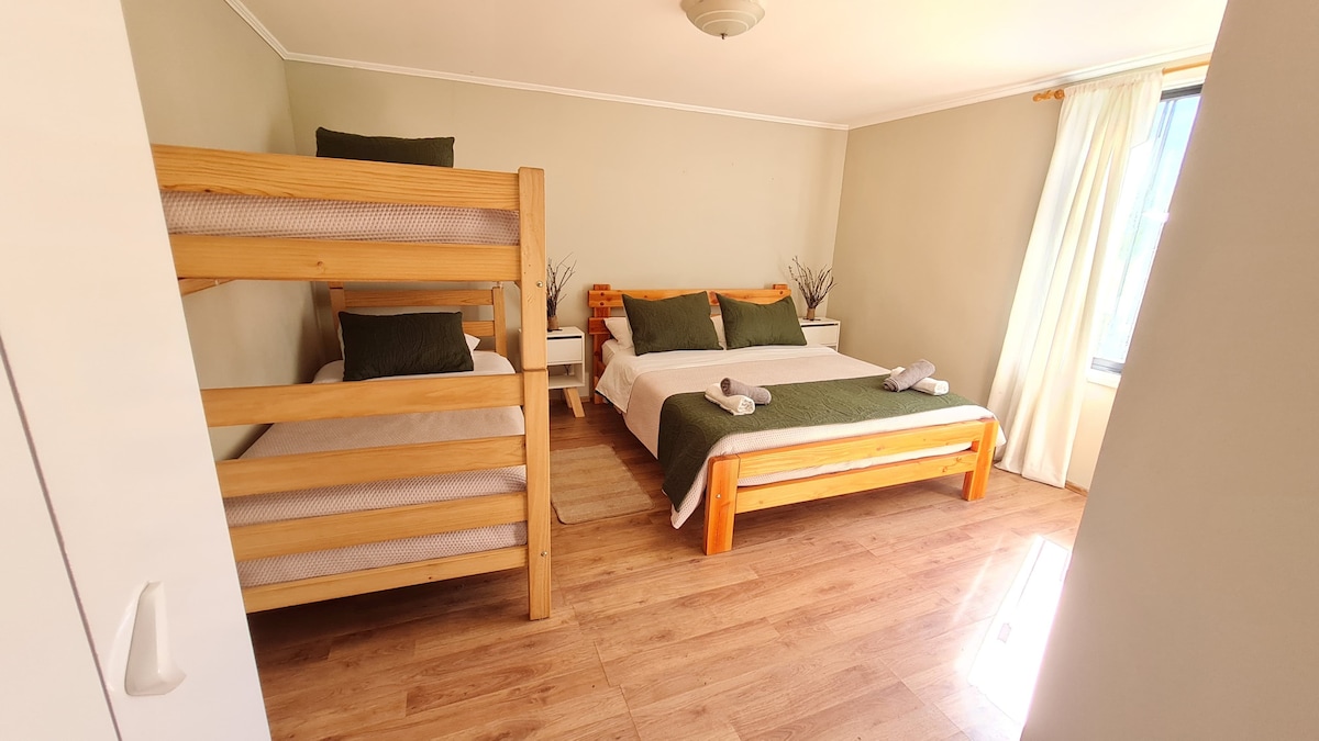 ¿Qué incluye? ° Cama matrimonial ° Baño privado ° Cocina equipada compartida ° Calefacción ° Toallas, papel higiénico, secador de pelo Nuestro alojamiento se ubica a 5 min. del centro de Pucón con acceso directo a ciclo vía y locomoción colectiva, además, cuentas con; estacionamiento, Wifi y calefacción. Beneficios Adicionales • Acceso a terrazas y áreas comunes • 50% de descuento en Mini Golf Pucón • Somos Pet Friendly (tarifa aparte)