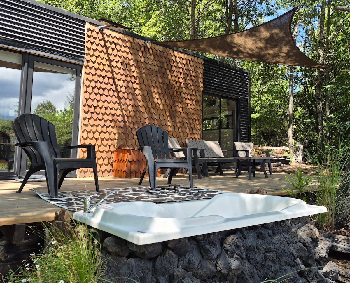 Cabaña para 2 personas, Incluye bicicletas MTB de paseo y opción a tinaja caliente privada ($40.000 adicional). Tiene una espectacular vista al Volcán Llaima y el lugar está rodeado por un bosque precordillerano. El Parque Nacional Conguillio se encuentra a 8 km. Por el lugar pasa el río Captren y se encuentran Los senderos de la Laguna Negra, geositios que forman parte del geoparque KutralKura. También cerca está el centro de esquí, reservas naturales, ciclovías, termas y saltos de agua.