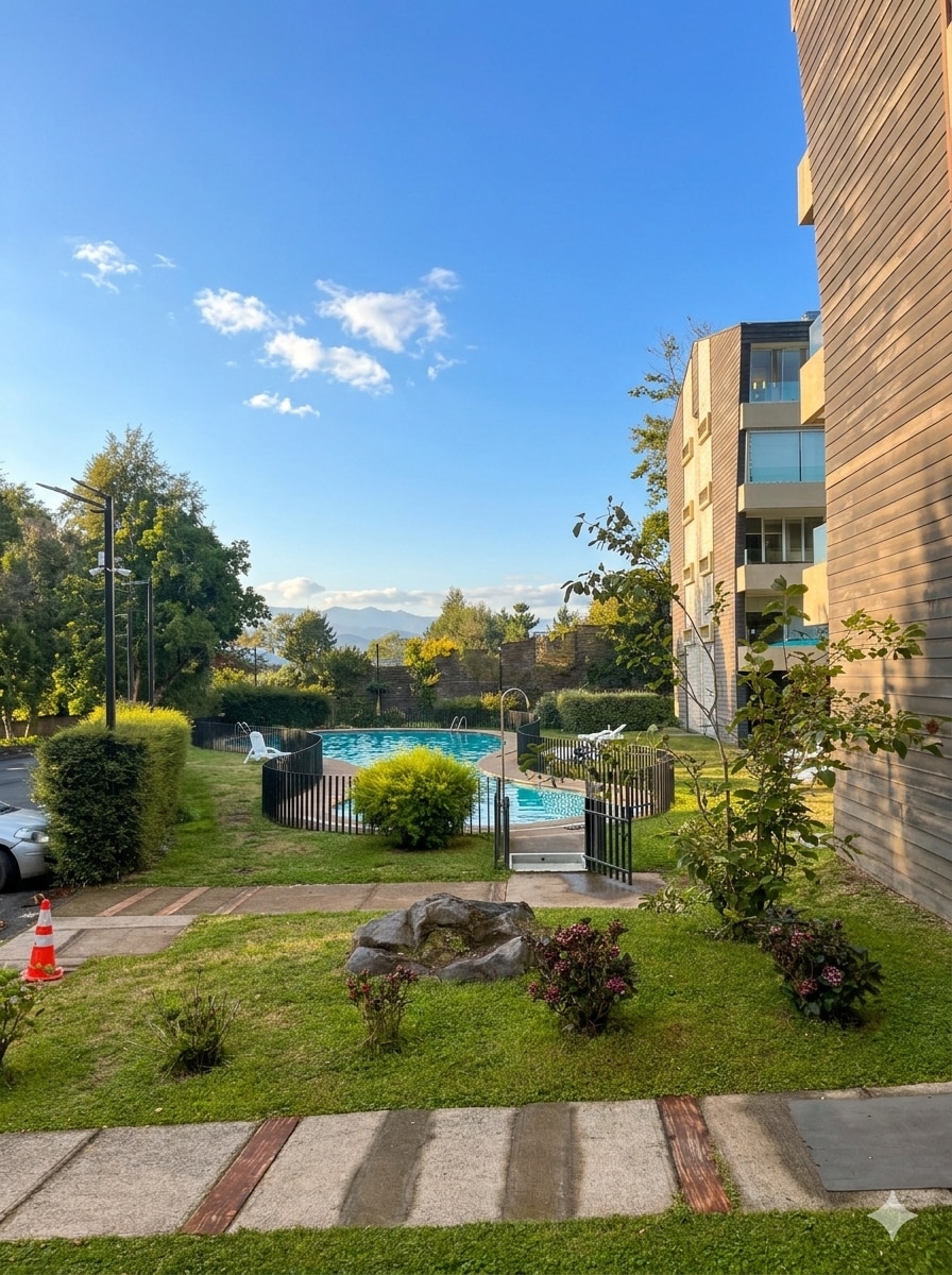 Departamento estudio cercano al centro. Completamente amoblado, con ventanas de termopanel y vista al volcán. El dpto incluye: Cama matrimonial Cocina americana equipada Amplia terraza equipada Parrilla eléctrica Calefactor eléctrico Estacionamiento privado *Se desinfecta con Amonio Cuaternario. Otros servicios: Piscina exterior, gimnasio, sauna, sala de juegos, quincho y lavandería.