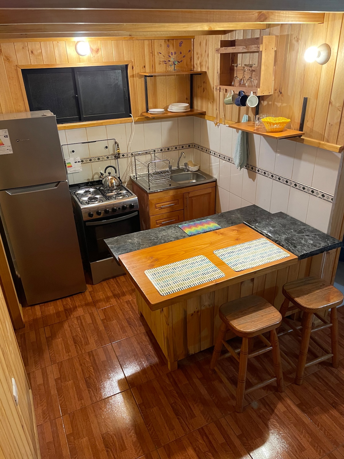 Habitación equipada completa para dos personas en patio trasero. Cocina, lavadora, estacionamiento gratuito, wifi de alta velocidad y parrilla. el lugar es sencillo pero muy acogedor y tranquilo. nos encontramos en Pucón a sólo 5 minutos del centro mismo y unos 25 caminando locomoción publica a la puerta ( colectivo n 3) Uber y algunos negocios cercanos para compra de alimentos basicos