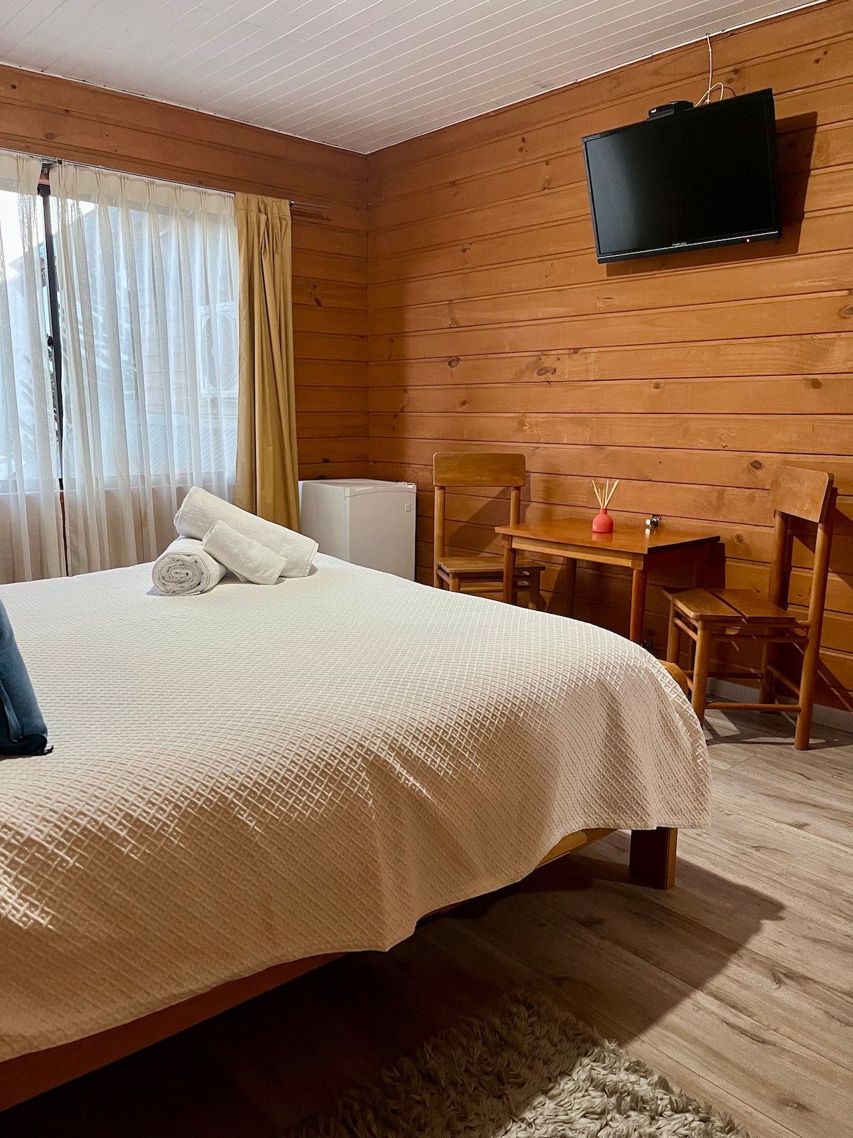 Te invitamos a conocer nuestra encantadora habitación doble pequeña, una opción perfecta para aquellos viajeros que buscan una experiencia íntima y acogedora en la hermosa ciudad de Pucón. La habitación cuenta con baño privado, cama king size, aire condicionado y esta se encuentra en el cuarto piso. Es importante tener en cuenta que contamos solamente con escaleras en nuestro hotel. Disfruta de nuestro rico desayuno artesanal.