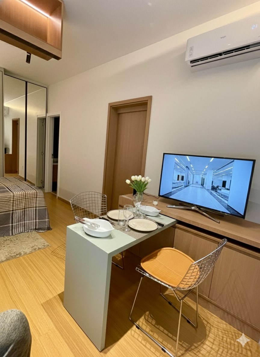 Viva uma experiência única neste estúdio acolhedor e elegante, projetado com atenção aos detalhes para oferecer conforto, funcionalidade e muito estilo. O ap azul planejado é um diferencial exclusivo, com iluminação suave e decoração pensada para relaxar, móvel inteligente e versátil que se transforma em mesa de jantar ou apoio para cozinhar — perfeito para quem valoriza funcionalidade. Piano digital disponível para relaxar, praticar ou se inspirar. Smart TV, Wi-Fi.