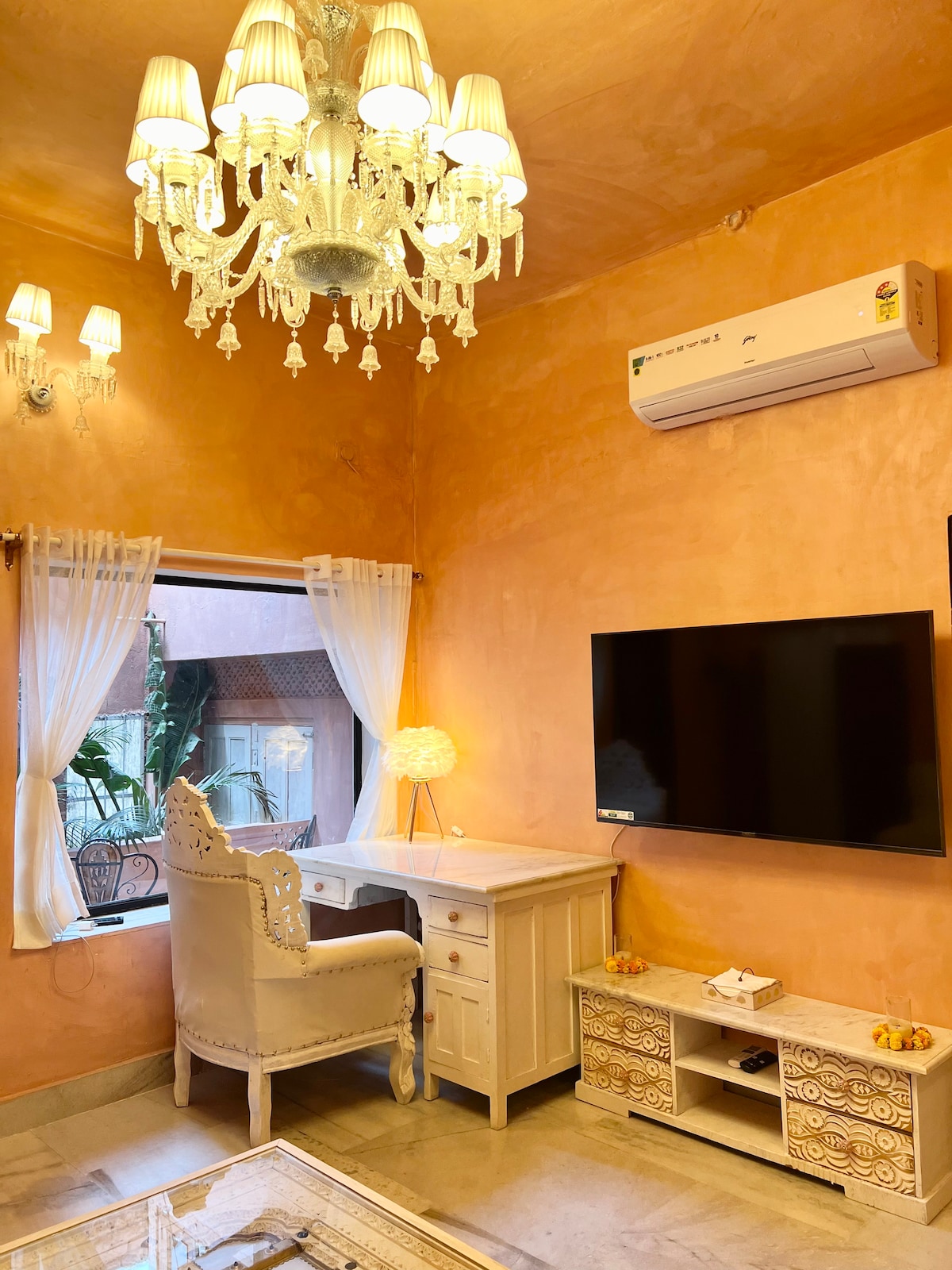 "The Golden Door" is an artistically designed room with an attached bathroom on a private terrace with panoramic views of the Aravali Hills. Ideal for couples, solo travelers, and business professionals, this accommodation seamlessly blends aesthetics and functionality. Its central location grants easy access to major attractions. In essence, "The Golden Door" transcends conventional stays. With its central location, artistic design, and comfort, it provides a simple yet unique stay.