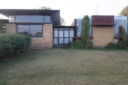 The Glass House is a 2 Bedroom Pool Villa with stunning view of Aravalis - farmlands and orchards. We can accommodate around 6 person in this two bed room villa We don't offer Luxury but Warmth & Comfort; offering simple food and an experience. People who loved staying here were Nature Lovers, Artists, Writers, Group of Friends who want to reunite and spend some time, Families who want to expose their kids to nature and Farm life and Human Beings who want to spend time in the hills.