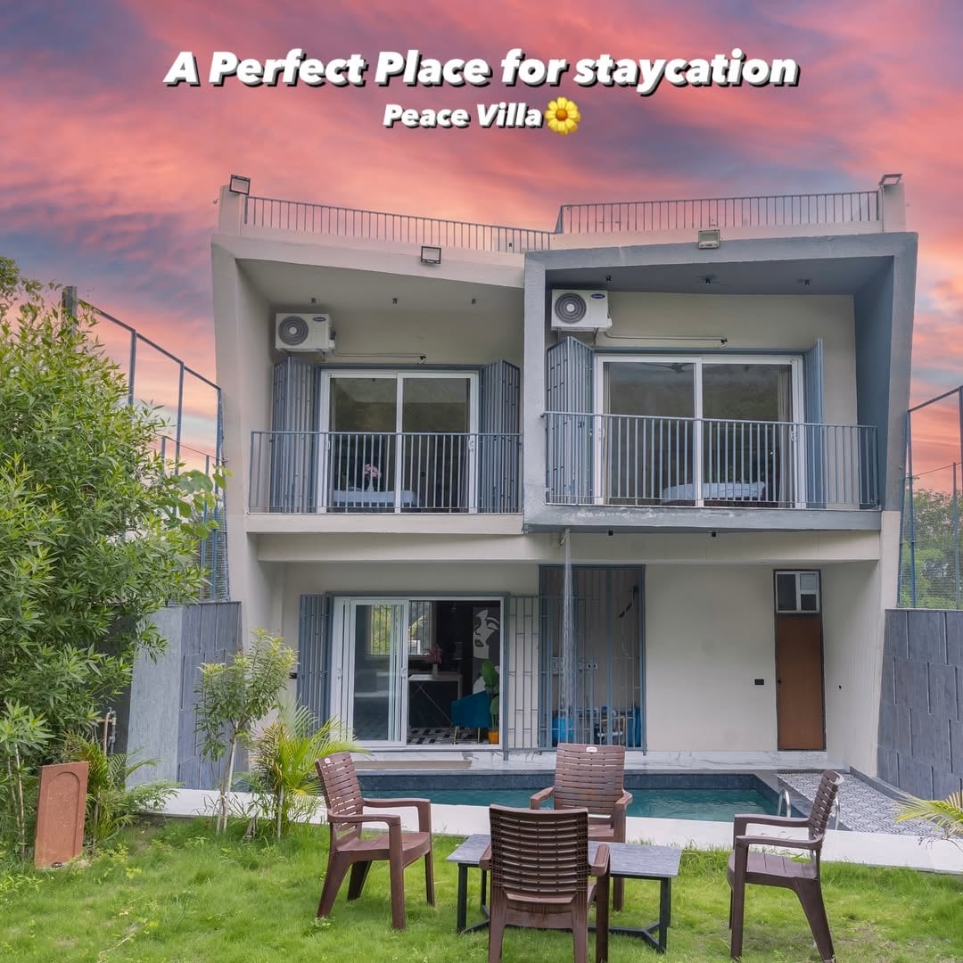 • <b> Luxury Aravalli Villa </b>: 15,000 sq ft, 3BHK, pet-friendly, private pool & Jacuzzi. • <b> Complimentary</b>: Welcome basket & 1 hr bonfire (Dec/Jan). • <b> Gourmet Kitchen</b>: Fully equipped with Oven, and chef (on call). Zomato/Swiggy delivery available. • <b> Entertainment</b>: 4,000 sq ft lawn, pool table, indoor/outdoor games, 75" Smart TV. • <b> Full-Service</b>: 24/7 caretaker, chef available, parking for 5 cars.