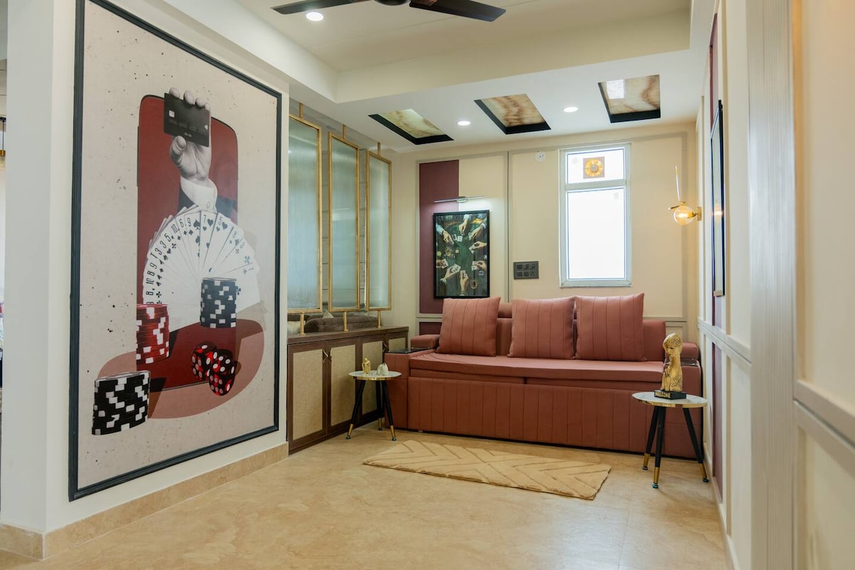 Escape to The Wooden Gem Penthouse, a perfect blend of rustic charm and modern luxury. Unwind in stylish bedrooms with warm wooden accents, relax in a private jacuzzi, or enjoy a home theatre experience with a large projector screen. The elegant bathrooms feature sleek designs and premium amenities. Cozy seating areas and ambient lighting create a serene retreat. - Property is on Third floor and Elevator is available. PLEASE NOTE: - NO LOUD MUSIC; only moderate volume after 10 PM.