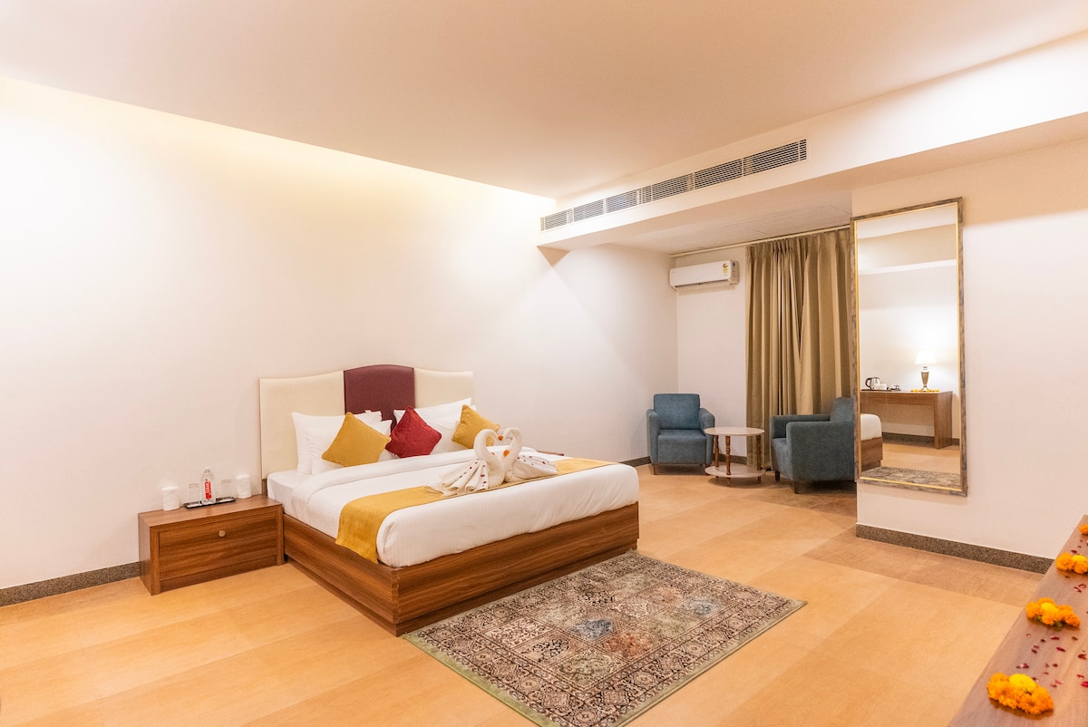 The Casa99 Premium Suite offers a luxurious and spacious retreat, featuring a comfortable bedroom. The suite is equipped with soft sofas for relaxation, an attached modern bathroom, and a fully equipped kitchen with essential appliances like a stovetop, fridge, and cookware. With elegant decor, ample space, natural light, complimentary Wi-Fi, and air conditioning, the Premium Suite ensures a refined and comfortable stay.