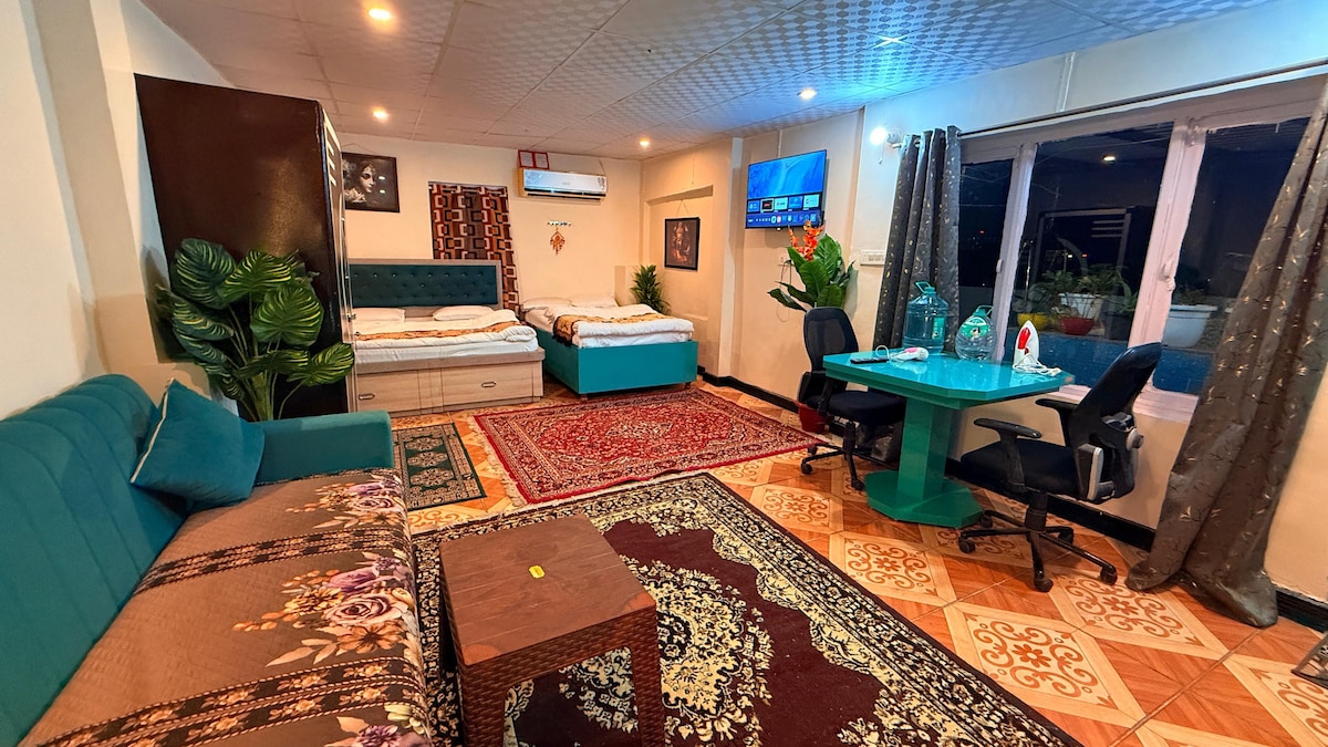 Indulge in the regal essence of Rajasthan within this exquisite suite, meticulously crafted with timeless tradition and contemporary design. This space offers a living room, bedroom, bathroom, and a serene terrace, granting guests exclusive access to the entire floor. Stroll through the verdant terrace, a tranquil oasis that transports you far from the city's clamor and commotion, evoking a sense of serenity. A cozy kitchenette is also at the guests' disposal, ensuring convenience and autonomy.
