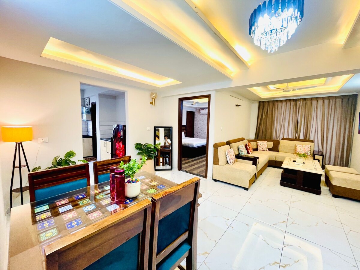 Located in the heart of Jaipur in the charming residential area of Bani Park, the apartment offers a blend of comfort and style. Enjoy luxe amenities like a smart TV, a fully equipped kitchen, fresh bedding, high-speed internet, and in-house laundry with ironing facilities. The muted tones, soft hues, and handprinted floral motifs inspired by the Pink City create a warm, vacation-ready vibe—making it a perfect home away from home during your Jaipur visit.
