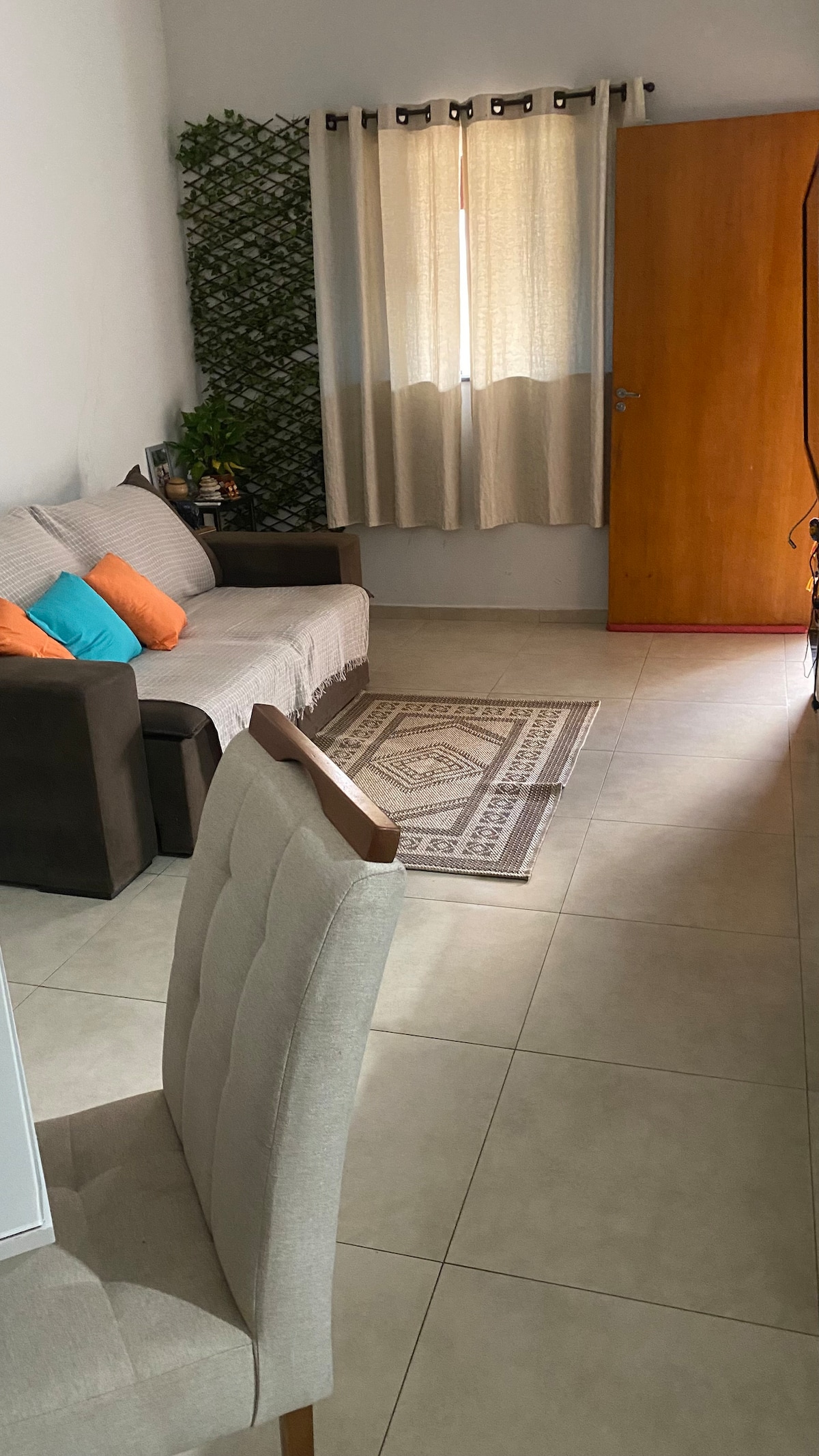 Localizado em bairro seguro e tranquilo, com fácil acesso às principais rodovias para acessar a cidade e comodidades, como academia, supermercados e farmácias. - Quarto com cama de casal, ar condicionado, armários planejados, TV. - Sala com sofá cama, TV, ar condicionado. - Cozinha/lavanderia: armários planejados, fogão, geladeira, filtro anexado à torneira, microondas e utensílios básicos (copos, pratos, talheres e panelas). Obs. Não aceitamos animais de estimação no espaço.