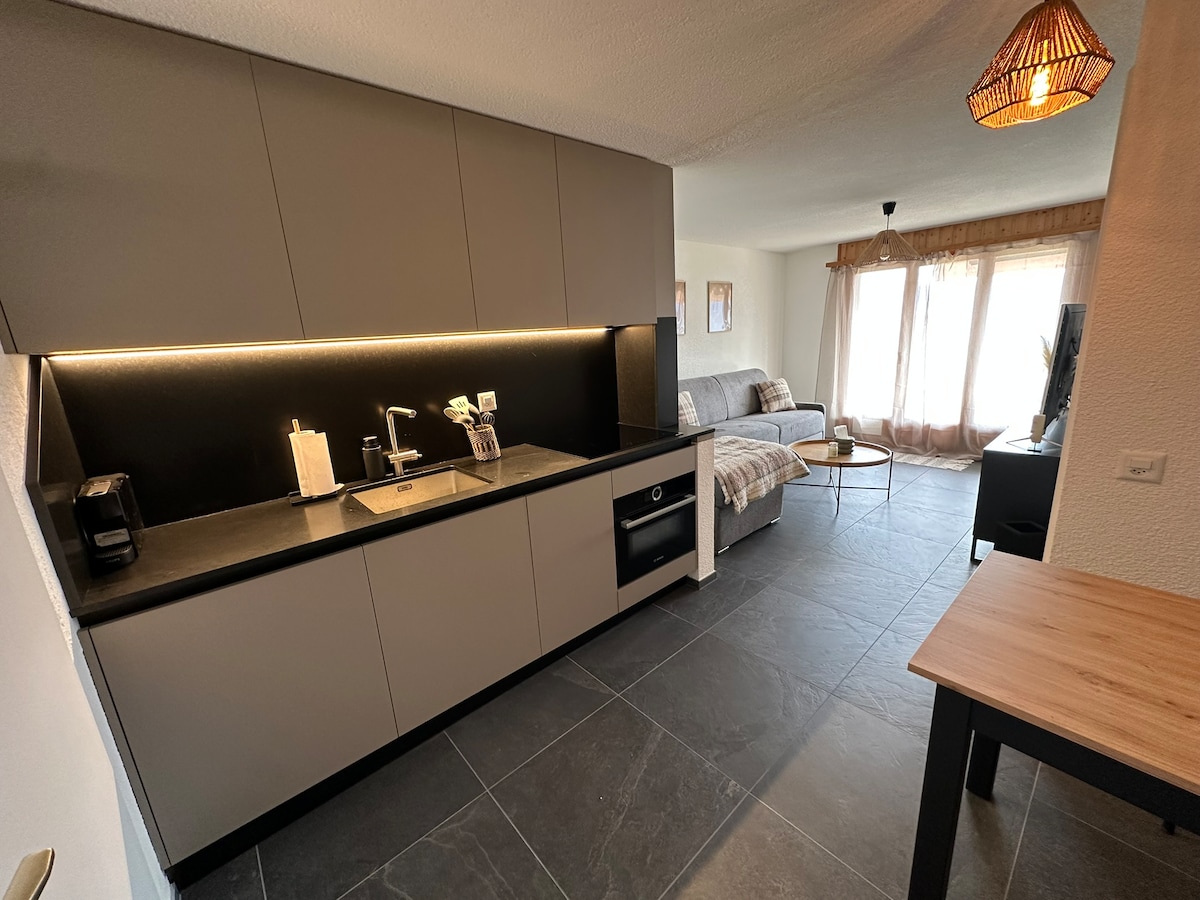 Situé à 5 min de Sion en voiture, un studio meublé avec un lit-canapé 160/200, cuisine, salle de bain et chauffage au sol, une petite terrasse vous permet de bien profiter du soleil et barbecue, une vue au sud sans vis-a vis, un parking privé est juste devant la maison, Le Wi-Fi mobile est fournit pendant des séjours, une station d'essence et un magasin DENNER en deux pas, la ligne de 351 /353 vous amène jusqu'à la gare de sion, passez un moment serein et calme, soyez les bienvenus !