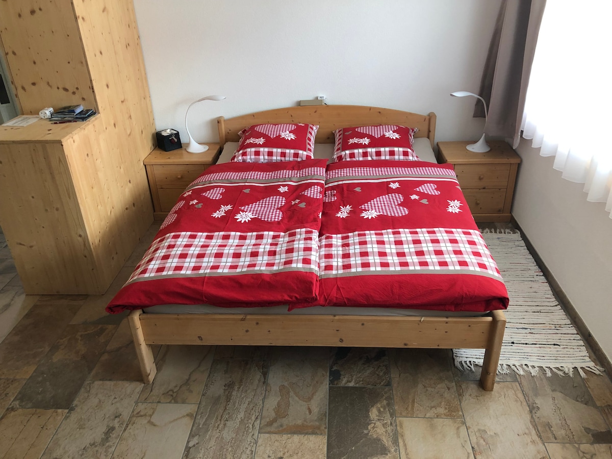 Dans les Alpes suisses, à 30 min des principales stations de ski, vous trouverez au sein de notre villa familiale un appartement de 2,5 pièces. Vue magnifique sur les montagnes/Cervin et le village, proche du vignoble. Paisible. Profitez gratuitement d'un jacuzzi de notre côté du jardin familial. L'appartement privé se compose d'1 chambre séparée, salon, cuisine ouverte avec baie vitrée sur la terrasse (à usage exclusif pour vous), canapé lit. Télévision, Wi-Fi. Douche WC, colonne de lavage.