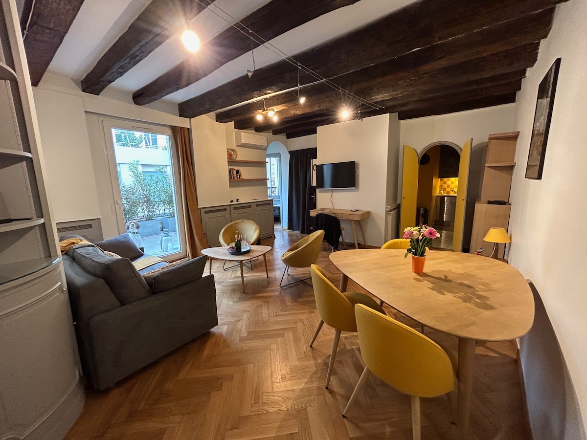 Idéalement situé, en plein cœur du Marais, à l'angle Archives, Francs Bourgeois, Rambuteau. Appartement de caractère, lumineux et calme, 60m2+, 1er étage, typique entresol Marais avec grande baie vitrée À proximité tous Commerces et Transports Salon plein de charme, baigné de lumière: baie vitrée, colonnes, moulures, parquet en chêne Cuisine américaine donnant sur le salon Chambre pour 2 personnes calme donnant sur cour, avec placard-penderie Petite salle de douche avec WC et fenêtre sur Cour
