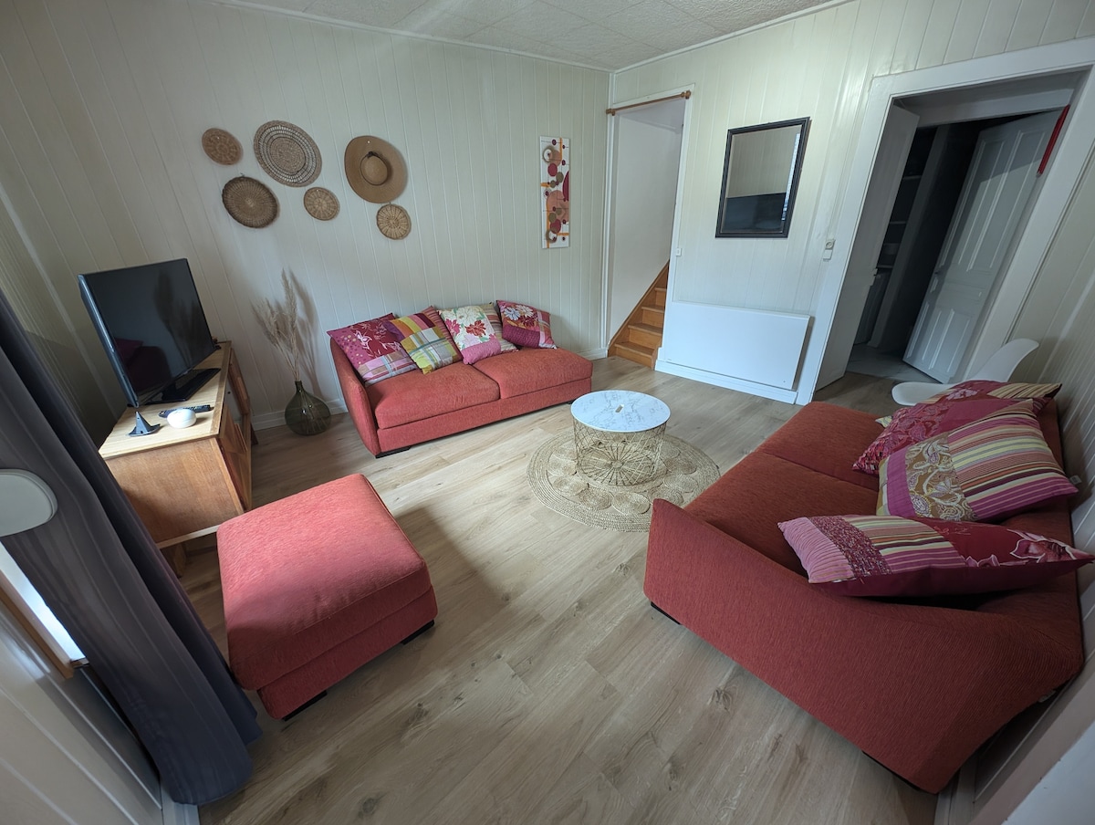 Maison mitoyenne aménagée pour 4 personnes. Hall d'entrée, cuisine indépendante équipée, séjour avec TV écran plat. A l'étage : 2 chambres, l'une avec 2 lits 1 place et l'autre avec 1 lit 2 places (draps fournis). Salle d'eau avec grande douche à l'italienne. Terrasse et terrain attenant équipé de salon de jardin, barbecue et chaises longues. Lit parapluie et chaise haute à disposition. Possibilité forfait ménage fin de séjour :50€