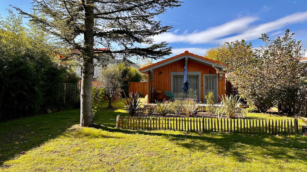 Chalet en bois douillet et spacieux de 43m2 avec terrasse, entièrement équipé, situé sur un terrain arboré au calme. Pièce de vie avec coin cuisine, une chambre, une salle d’eau, toilettes séparées. La gare et les commerces sont situés à 5 minutes à pieds, la réserve ornithologique, le port et un bassin de baignade à 15 minutes. Note : pour le mois de juin 2026, exceptionnellement, nous n’accepterons pas de séjour de moins de 5 nuits.