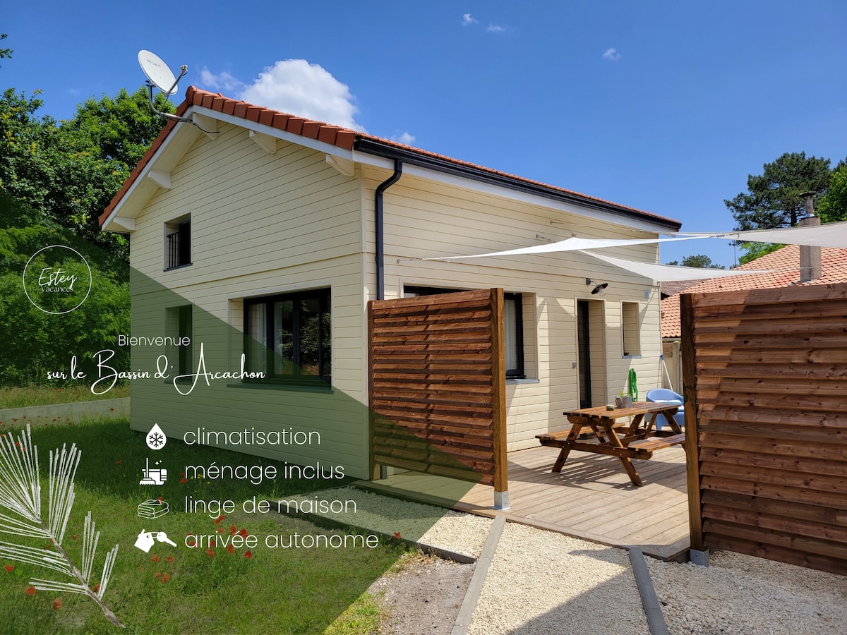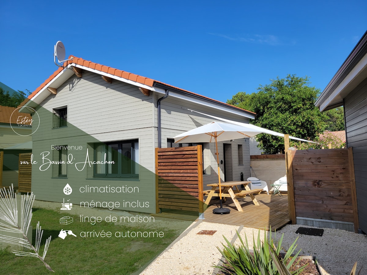 Maisonnette située au coeur d'un grand jardin arboré, au calme, à proximité de la piste cyclable, des forêts, de l'eau-baignades - plages océanes & plages du bassin, activités nautiques, ports ostréicoles & de tous commerces. Terrasse ombragée & hamac. Confort : linge de lit, de toilette, de cuisine & vélos à disposition. Accueil jusqu'à 3 pers. Bb/enf. bienvenu. Télétravail : bon réseau wifi (routeur). Accès facile Arcachon & Bordeaux. A l'envie, petit déj' à la carte en supplément sur place.