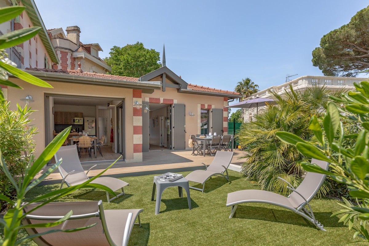 50 m from the Mauresque Park, Arcachonnaise on one level, air conditioning and fiber. Composed of 3 bedrooms, 2 bathrooms, 2 toilets, large living room (kitchen, dining room and living room). Rolling shutters. Parking for 1 car. 300m from the city center, 400m from the beach, 700m from the train station. Enclosed landscaped garden, 55 m2 terrace, garden furniture, plancha, sun loungers and deckchairs. Premium location in the historic Winter Town district.