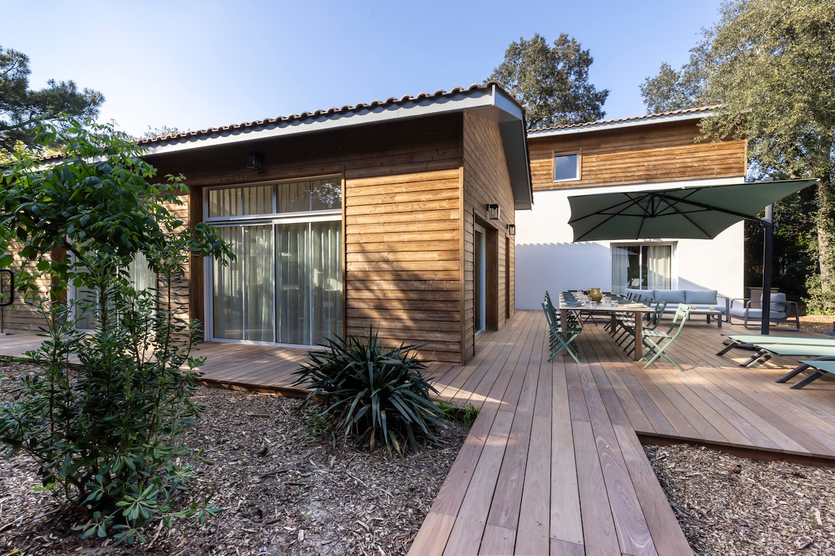 Location de notre jolie Villa en bois sur les hauteurs du Pyla sur mer, dans un quartier calme & arboré. Tout juste rénovée par un architecte, la maison propose tout le confort nécessaire : -5 chambres -2 salles de bain -grande pièce de vie avec cuisine équipée, grand séjour & salle a manger -buanderie -terrasse, jardin & petite piscine (sécurisée) A 5 min a pieds de la plage. Vue bassin depuis la terrasse pour profiter des couchers de soleil. Idéale pour des vacances en famille ou entre amis