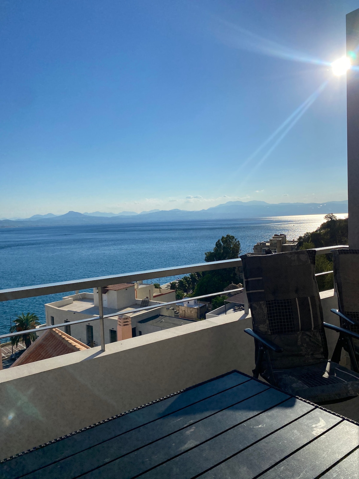 Sunny, and comfortable apartment with a splendid balcony with unique views of Bourtzi and Palamidi. Our place is located just outside the historical part of Nafplio. Shopping, restaurants, and bars are easily accesible on foot but we also provide free parking. The apartment is fully air-conditioned and with strong Wi-Fi in all rooms and can host up to seven guests in comfort and style.