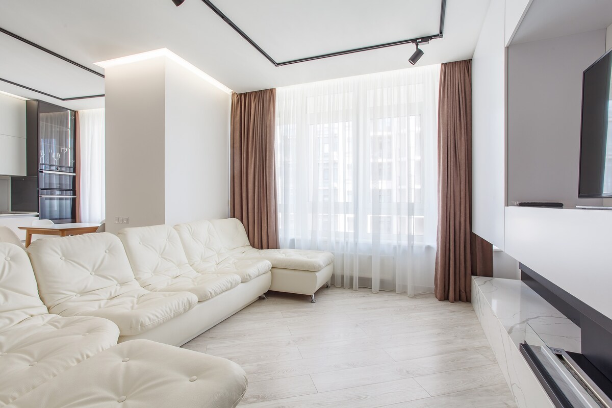 🏙️ Located on the 21st floor of a 25-story building. 🕓 Check-in anytime, 24 hours a day! No worries if you arrive late at night 🌙 ❗ All bedding is professionally cleaned in a dry cleaner! ❗ Indoor Shelter! (Undeground Parking) 💰 Included in the price: 🛏️ Comfortable Stripe Satin bed linen 🍽️ All dishes and kitchen utensils 🩴 Disposable slippers 🧼 Soap and shower gel 🌐 High-speed Wi-Fi internet ☕️ Espresso coffee machine + coffee 🍵 Tea assortment in sachets