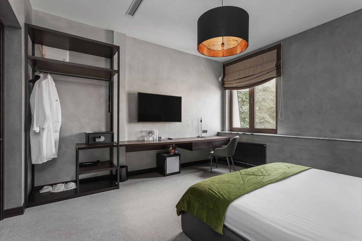 Улучшенный двухместный номер, 27 м² — для 1–2 гостей. Уютный и тихий номер с видом во внутренний двор. В номере одна двуспальная. Кондиционер, звукоизоляция, собственная ванная комната, быстрый Wi-Fi, ТВ, мини-бар, чайник и кофеварка, рабочий стол. Бесплатная парковка и высокоскоростной интернет включены. Отлично подходит для отдыха и деловых поездок.