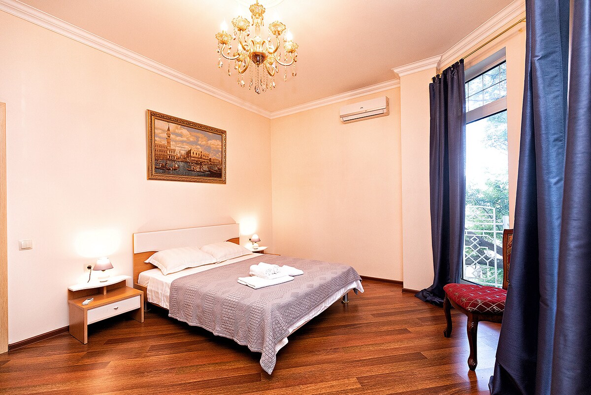 У цій просторій оселі вся помешкання створене для комфортного відпочинку. Воно розташоване у новому будинку з сучасним інтер’єром, швидким Wi-Fi, кондиціонером і рециркулятором повітря, ванна кімната з феном, пральною машиною і електричною сушкою для рушників. У цій просторій оселі вся ваша сім’я зможе чудово провести час.В помешканні два великих телевізора 43 дюйми, витяжка, духова і мікрохвильова печі, пральна машина, чайний набір, повний набір посуду, холодильник , халати, кондиціонер.