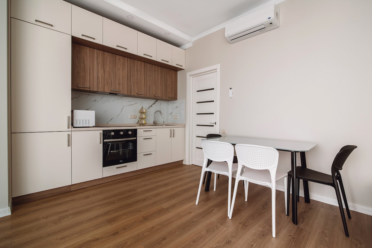 🏙️ Located on the 11st floor of a 25-story building. 🕓 Check-in anytime, 24 hours a day! No worries if you arrive late at night 🌙 ❗ All bedding is professionally cleaned in a dry cleaner! ❗ Indoor Shelter! (Undeground Parking) 💰 Included in the price: 🛏️ Comfortable Stripe Satin bed linen 🍽️ All dishes and kitchen utensils 🩴 Disposable slippers 🧼 Soap and shower gel 🌐 High-speed Wi-Fi internet ☕️ Espresso coffee machine + coffee 🍵 Tea assortment in sachets