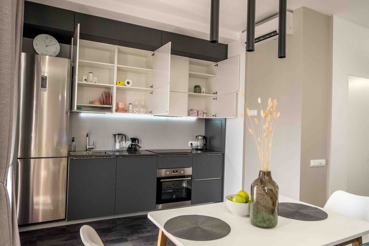Отлично проведите время всей семьей в этом стильном и уютном жилье. Новая квартира находится в жилом комплексе у моря, к Вашему удобству предоставляем место в паркинге бесплатно, откуда Вы сможете на лифте подняться в светлую квартиру с балкончиком. Вашему удобству предоставляем всю необходимую бытовую технику, посуду и средства гигиены. Кухня выполнена в итальянском стиле, а спальня наполнена мягким светом, где можно отдохнуть и набраться сил