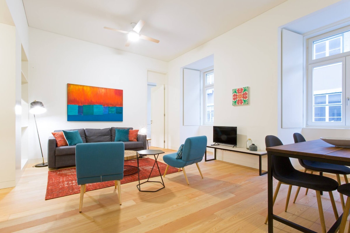 This trendy and stylish apartment is located in Baixa, Lisbon downtown, in a very central location and very close to Chiado. The decoration is upscale with beautiful paintings in the living room and comfortable setting throughout the entire flat with A/C. Recently refurbished, the building maintains the traditional character of Baixa, yet modern inside with two elevators. Just walk out from the building into the heart of Baixa where you can dine, shop and enjoy the best Lisbon has to offer!