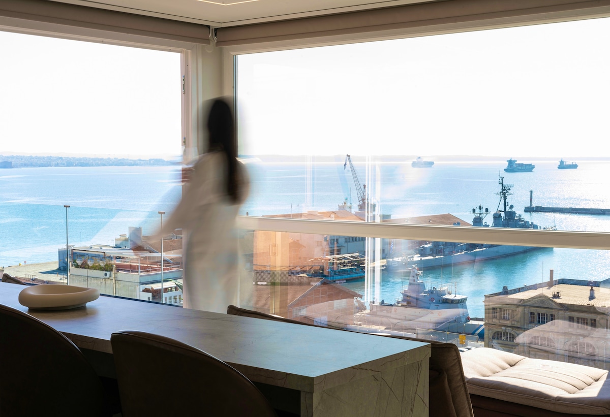 Unique 1 Bedroom fully equipped apartment on the seventh floor of a 2020 renovated building with a breathtaking terrace balcony. High speed internet, premium amenities, a luxurious queen size bed, and your very own Netflix account are but a few things we offer you. Luminous, spacious, with everything you might require to enjoy your stay in the heart of Thessaloniki's social life, only 5 minutes away from Aristotelous square and 2 minutes from the seafront. Welcome and enjoy your stay!