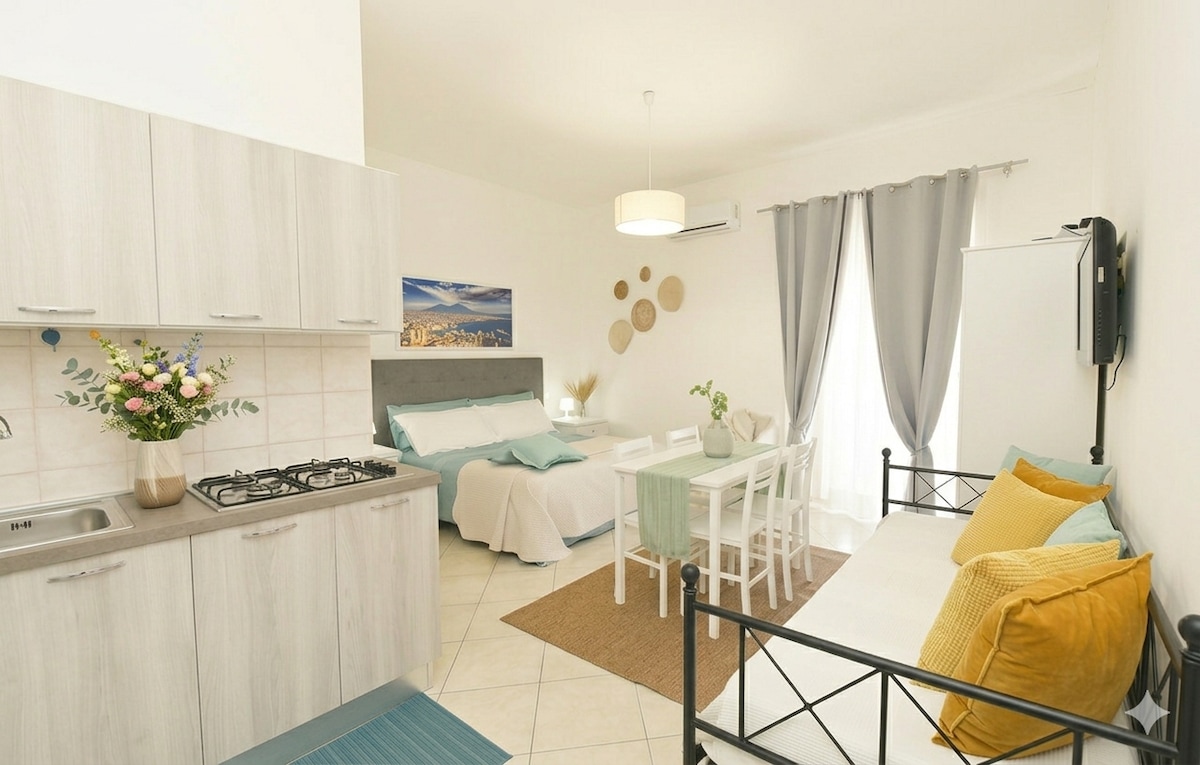 The Holiday Home is located in a secure private residence, a few steps from the center of Pompeii and the archaeological excavations and the Sanctuary and the main means of transport. The Holiday Home inaugurated in May 2023 is equipped with private covered parking and a common garden. Inside the house you will find all the main comforts including a complete functional kitchen and a laundry area equipped with a washing machine and dryer, you can also dry on the terrace in the open air.