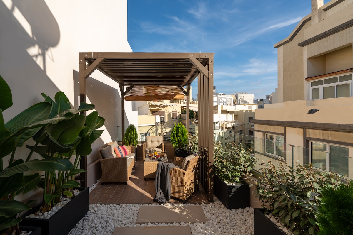 High end living for digital nomads and wellness lovers in Heraklion Crete. Ideally located in a peaceful neighborhood with easy access to E75 national road for day trips and beach days. It has free protected parking. The construction finished on November 2022, it occupies 135sq.m. in three floors and is built with premium materials and comfort in mind. If you want to stay in Heraklion for work, holidays or just need a wellness getaway for a few nights, this loft has something for everyone.