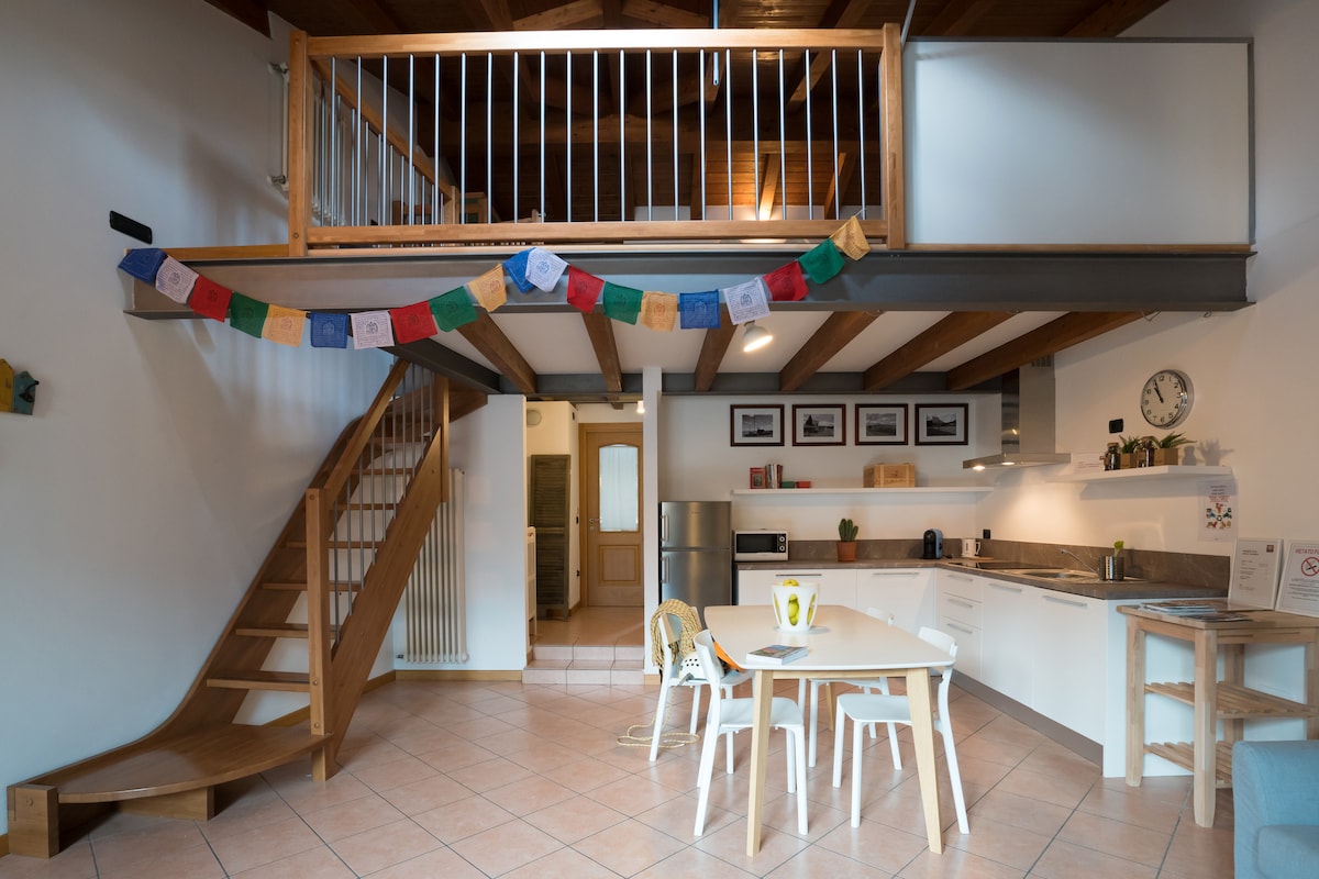 Appartamento moderno e accogliente con parcheggio privato recintato gratuito, garage per bici e giardino con BBQ / Gazebo. Situato al 2° piano con ingresso autonomo, ha 2 stanze con 2 posti letto ciascuna, open-space con cucina e soggiorno con divano letto matrimoniale, bagno con finestra e ampio balcone vista montagne perfetto per prendere il sole, mangiare all'esterno e godersi il panorama. È attrezzato di lavastoviglie, lavatrice, macchina Nespresso, Wi-Fi e Smart TV. Ospita fino a 6 persone.