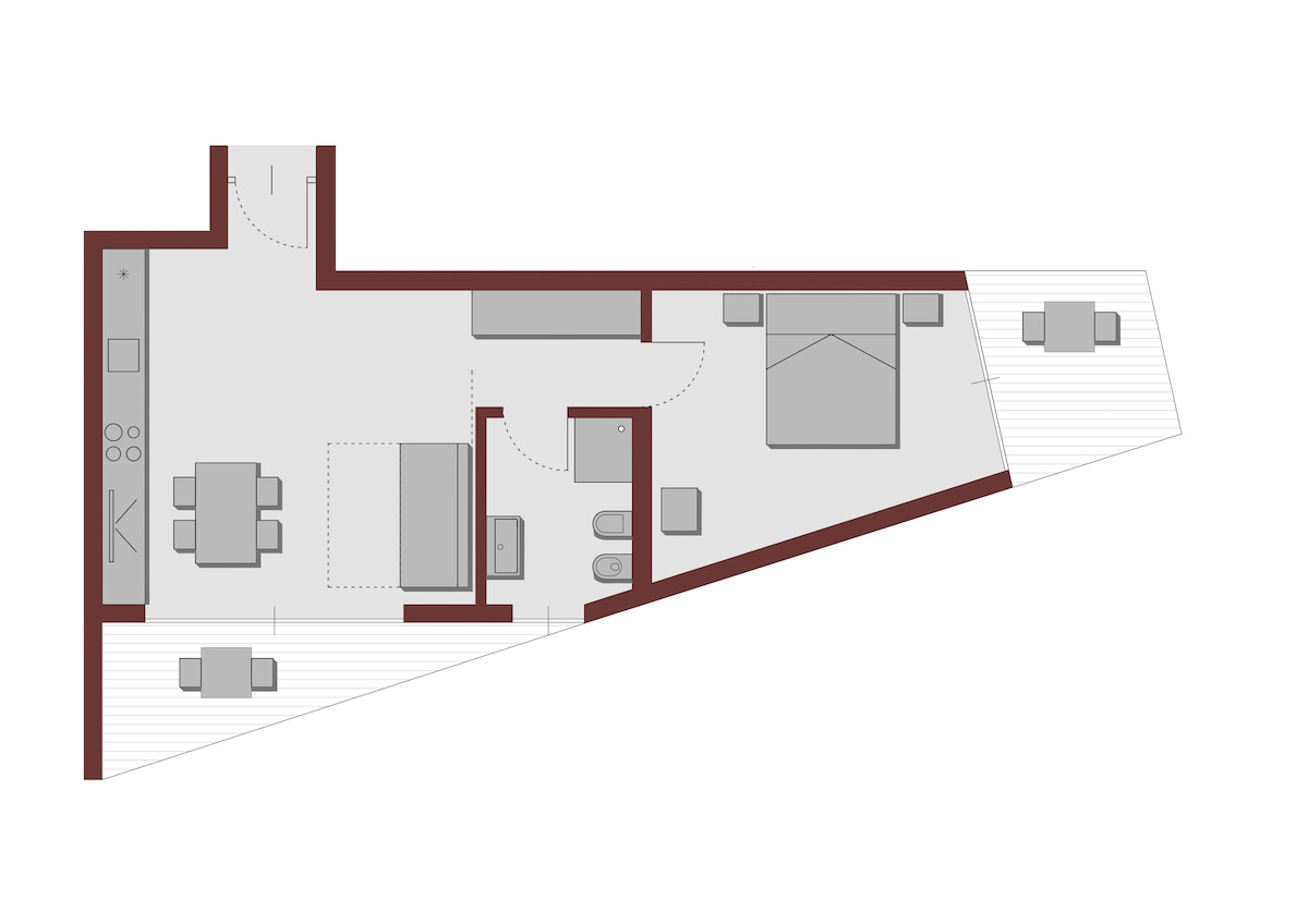 Appartamento moderno e accogliente con parcheggio privato recintato gratuito, garage per bici e giardino con BBQ / Gazebo. Situato al 2° piano con ingresso autonomo, ha 2 stanze con 2 posti letto ciascuna, open-space con cucina e soggiorno con divano letto matrimoniale, bagno con finestra e ampio balcone vista montagne perfetto per prendere il sole, mangiare all'esterno e godersi il panorama. È attrezzato di lavastoviglie, lavatrice, macchina Nespresso, Wi-Fi e Smart TV. Ospita fino a 6 persone.