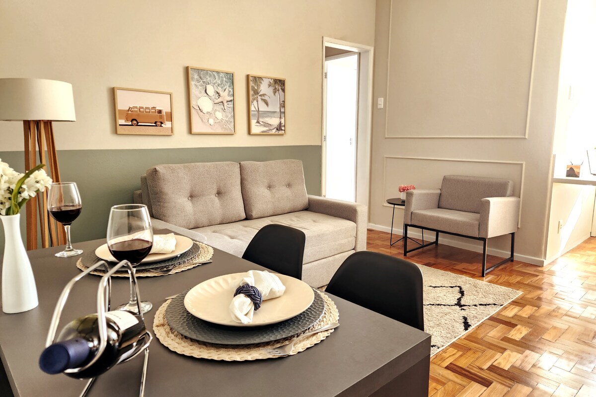 Studio 30 m² bem localizado no centro do Rio de Janeiro, próximo ao centro comercial da cidade e ao Aeroporto Santos Dumont, em condomínio recém reformado, e foi pensado em cada detalhe para proporcionar conforto máximo aos nossos hóspedes. Nesse apto você contará com: ar condicionado; sofá; mesa de jantar com bancos; mesa e cadeira de escritório; micro-ondas; geladeira; cooktop; forno, smart TV; secador cabelo; sanduicheira; cafeteira elétrica; ferro/tábua para passar roupas; enxoval completo.