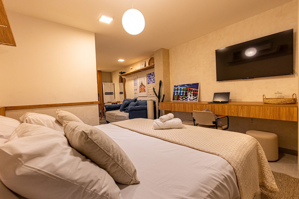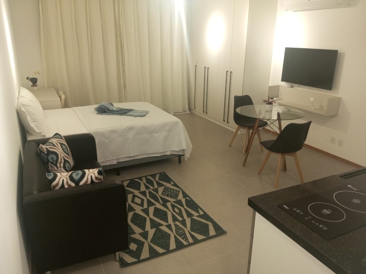 Relaxe e curta momentos neste espaço calmo e cheio de estilo. Localizado no condomínio de luxo do Apart Hotel Orizzonte esse loft conta com muito conforto e uma das vistas mais exclusivas e bonitas do Brasil. Apartamento em conceito aberto sala e cozinha, conta ainda com 1 quarto, closet , banheiro e 2 varandas debruçadas sobre um Cartão Postal. Apartamento equipado com 1 cama de casal Queen no quarto e 1 sofá cama de casal na sala . Microondas, geladeira, televisão e ar refrigerado no quarto