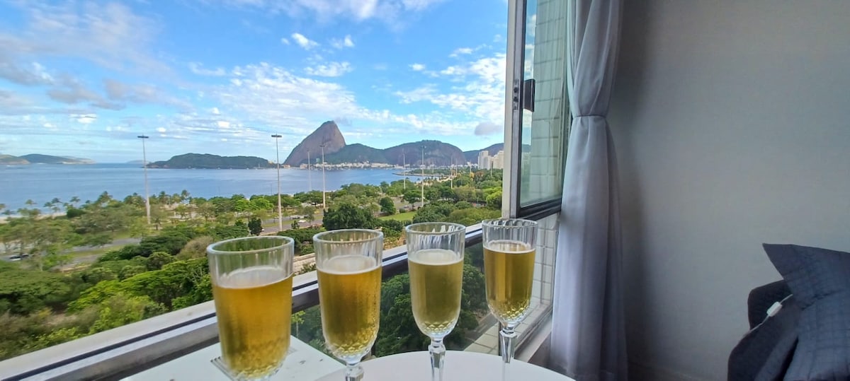 Clean cut studio with a queen size double bed. The airbnb has a breathtaking front view to Guanabara Bay and the Sugar Loaf. See the sunrise in the most incredible view of Rio de Janeiro. There is desk for home office, window unit air-conditioner, smart TV, fridge with freezer. Two ring gas stove and the apartment has a water filter and ceiling fans on both living and bedroom. Warm shower. 5min walk from metro station.