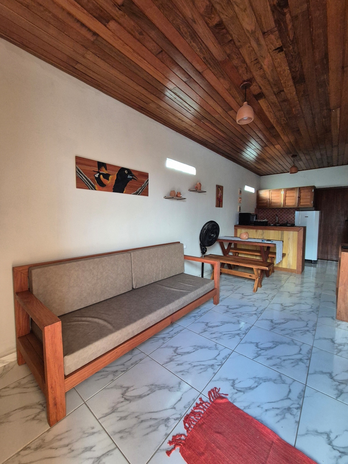 A cozinha está equipada com cafeteira, sanduicheira, microondas, fogão de duas bocas, geladeira e liquidificador, além de pratos, panelas e talheres.