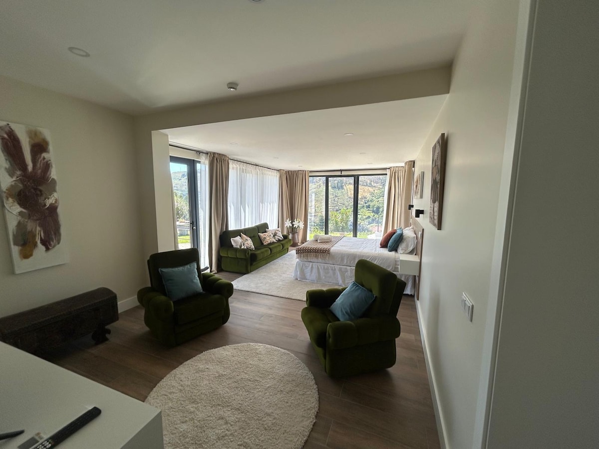 O Quarto Duplo com Casa de Banho Privativa é ideal para até três pessoas. O espaço tem 37 m² e dispõe de uma cama de casal grande e um sofá-cama, proporcionando flexibilidade para diferentes tipos de hóspedes. Este quarto inclui uma casa de banho privativa com duche, garantindo mais privacidade, além disso, conta com secador e os itens básicos. Possui também uma cozinha equipada, com frigorífico, televisão, e ar condicionado, ideal para obter tranquilidade.