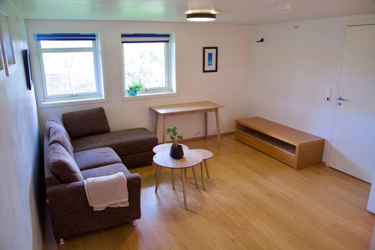 The apartment is located in the amazing Folkeparken, the largest public park and protected area on the island. The park has hiking trails, and cross country skiing in the winter. Telegrafbukta is located within the park, witch is known as a great place to experiance the northern lights. Other usefull amenities closeby include: gym and busstops 200 meters, Tromsø museum 550 m, grocery store 1,2 km and city center is within walking distance. Experiance the nature and urban living in close harmony