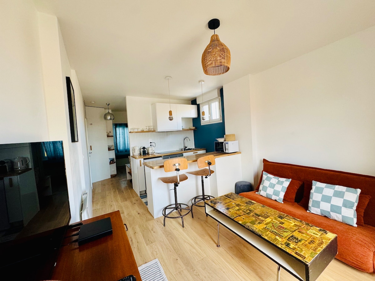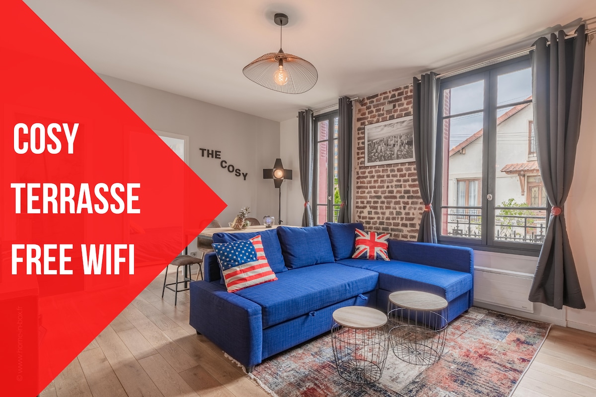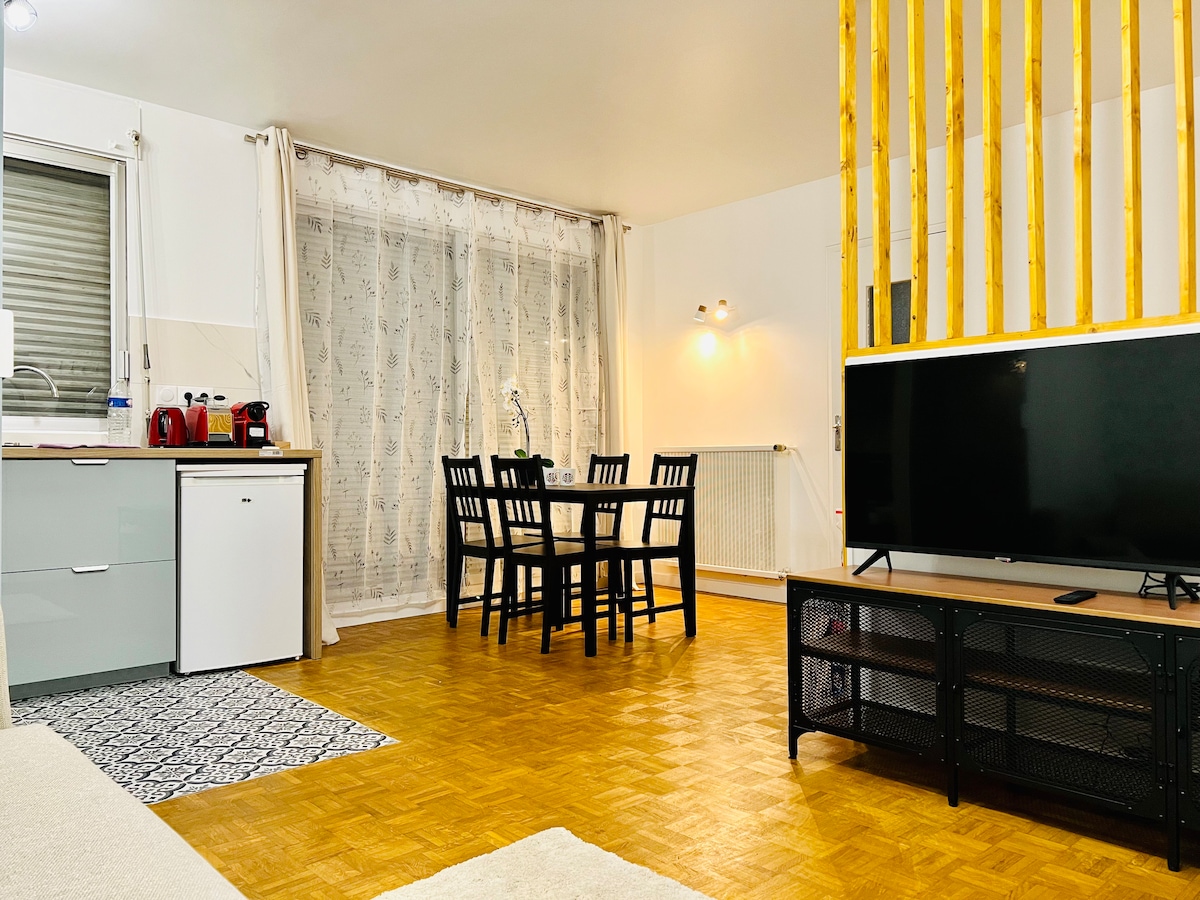 A 2 pas de Paris, bel appartement lumineux tout confort dans un quartier calme. Vous pouvez y séjourner jusqu'à 4 personnes. Il se compose d'une chambre ( literie de qualité), d'un salon (canapé convertible grand confort), d'une cuisine équipée. La salle de bains avec WC dispose d'un lave-linge et un grand dressing. Accès immédiat à Paris via RER, métro, bus, tramways et à vélos ( 2 en prêt sur demande). Tous commerces en proximité immédiate. Stationnement libre et borne de chargement.