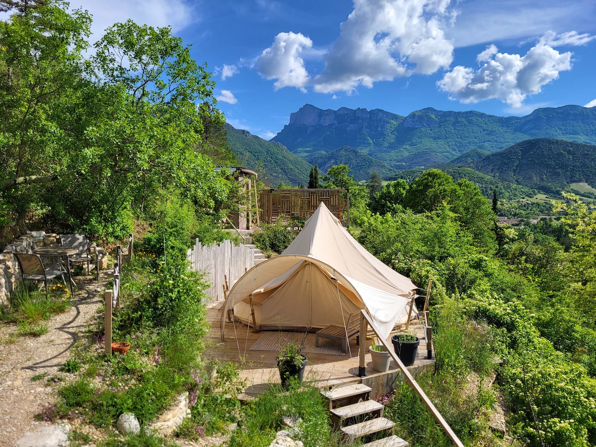 La Tente Lodge, est un hébergement insolite situé en pleine nature. Pour accéder à l'hébergement il faut monter un chemin à pieds d'une vingtaine de mètres, le véhicule reste en bas. Sur cet espace sans vis à vis, vous trouverez plusieurs terrasses aménagées, tables, chaises, transats, un chalet salle de bain avec douche, vasque, toilette, chauffage, une cuisine ouverte et couverte avec le nécessaire pour cuisiner, plancha, table à induction, frigo, barbecue, une mini piscine privée ( 3m x 1m)