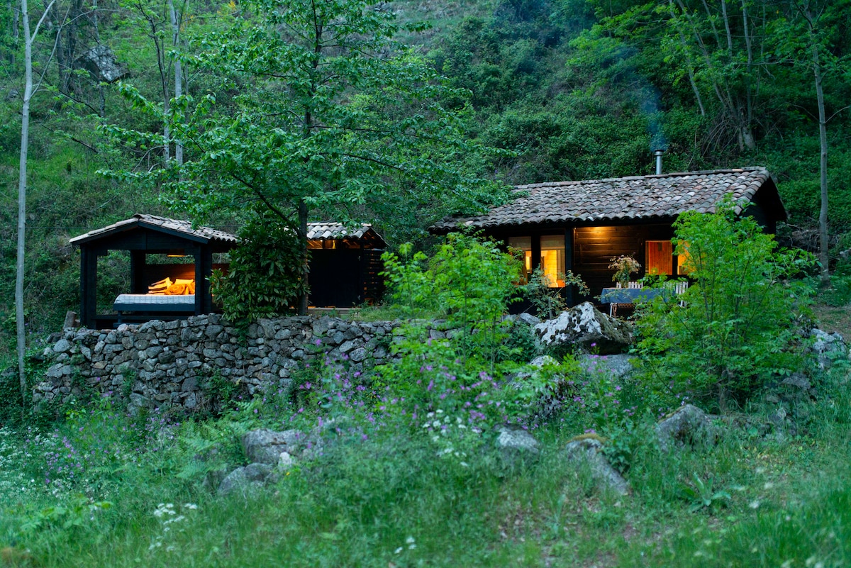 Our cozy cabin comprises of 3 small separate buildings set in private woodland next to a 200 year old poplar tree & a gentle rocky stream clattering in the background. The cabin is essentially off-grid meaning the water comes from the stream originating the “chalambelle” on the Ardeche plateau. There is electricity, hot water, shower, a compost toilet and a wood-burner. It is suitable for 2 people. Breakfast is included and brought to you in the morning. Dinner can also be arranged onsite.